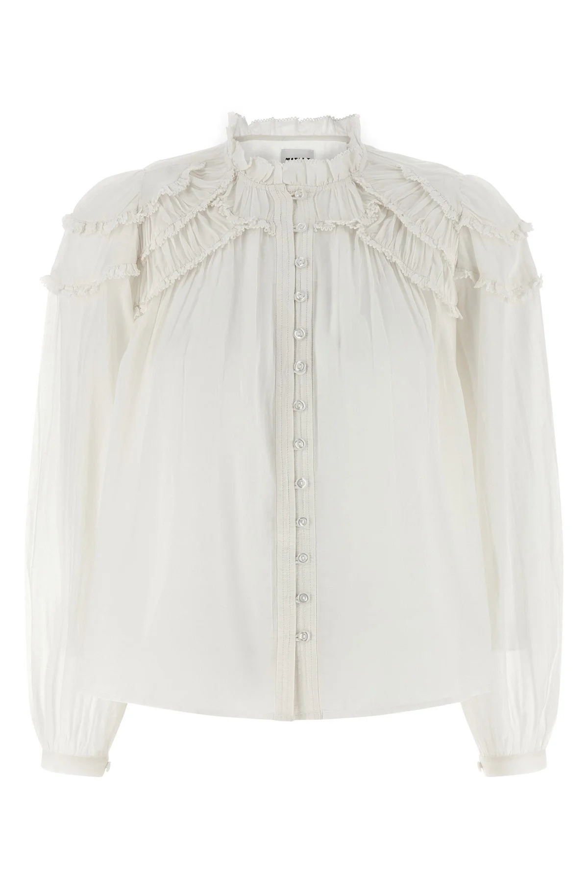 cod. HT0681FBB3J04E20WH 'Christa' cotton voile blouse with tone-on-tone ruffles at the front top, mandarin collar, front mother-of-pearl button closure, long sleeves with cuffs and a crinkled shoulder. Color: White Size & Fit: true to size fit - FRENCH size Composition: 80% cotton 20% viscose Made in: India