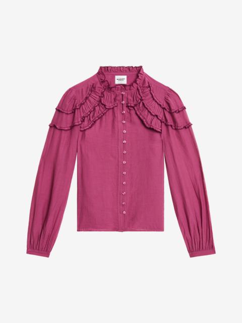 Gathered cotton blend blouse Round neckline with gathered finishes Buttoned front Gathered front and shoulder details Long sleeves with thin buttoned cuffs Rounded hem Relaxed fit Style: HT0681FBB3J04E01BK CHRISTA 80% cotton, 20% viscose