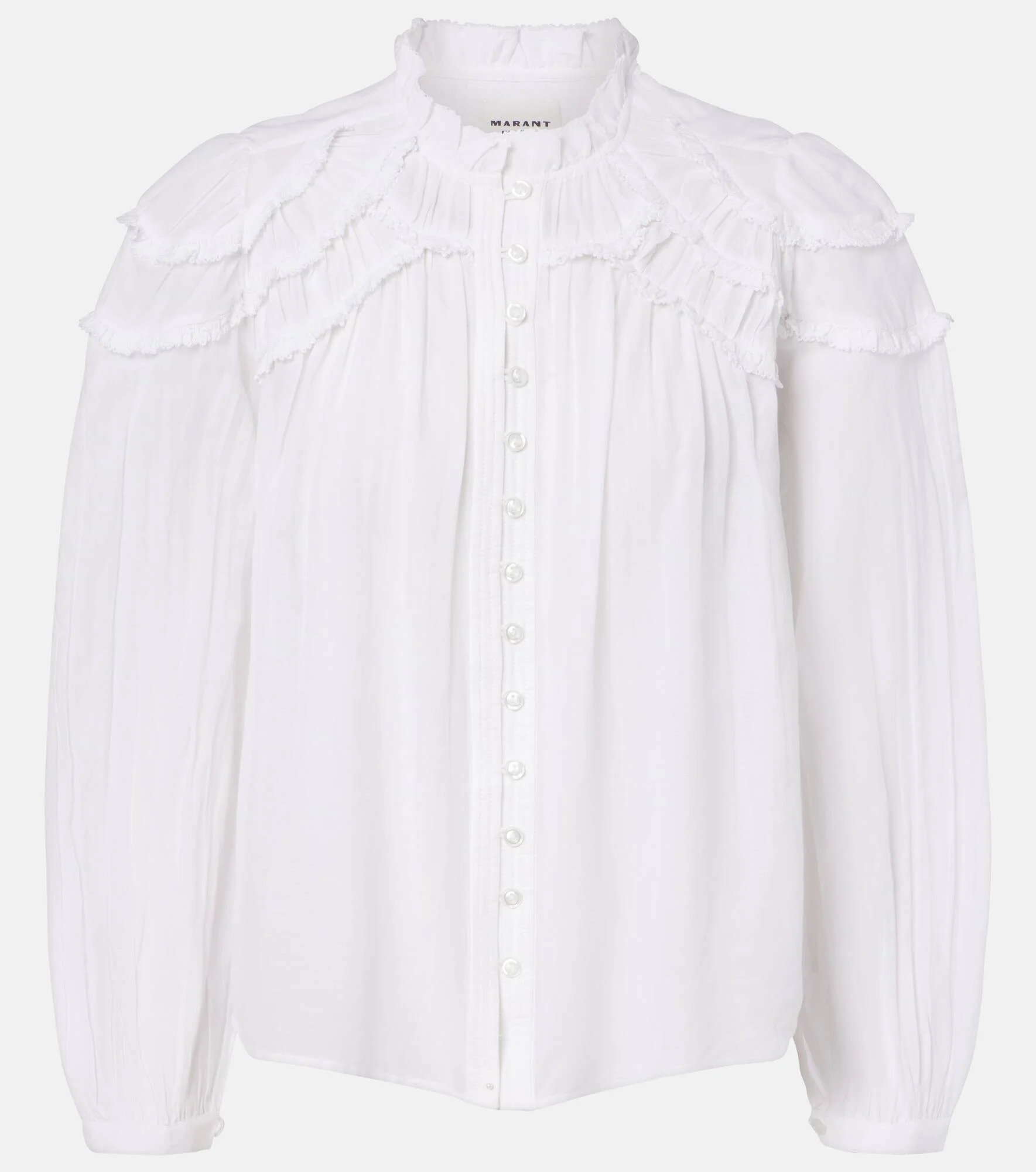 Hailing from Paris, Marant Etoile captures the art of French nonchalance through breezy yet polished staples, such as the Christa blouse. Crafted from a lightweight cotton blend, the white style features ruffled detailing throughout. Product Details - Material: 80% cotton, 20% viscose - Care instructions: dry clean - Made in India - Color: white - Designer color name: White/White - Embroidery: 100% polyester - Closure: buttoned front - Item number: P01132199 Size & Fit - True to size - Semi-sheer - Straight fit - Non-stretchy fabric - Falls to the hip - The model seen in the picture is 178cm-5'10" and wearing a size FR 36