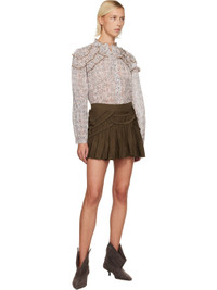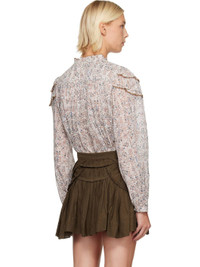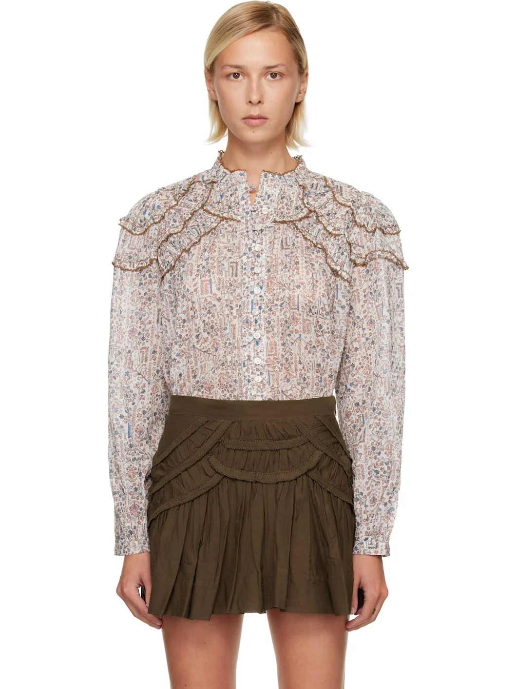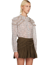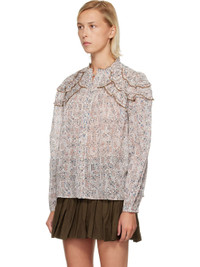 Semi-sheer cotton poplin blouse. · Graphic pattern printed throughout · Lace trim at round neck · Button closure · Panels with lace trim at shoulders · Gathering at cuffs and back yoke · Button fastening at cuffs Supplier color: Ecru 100% cotton. Made in India 252599F107004