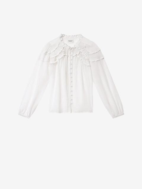 Gathered cotton-blend blouse Round neckline with gathered finish Buttoned front closure Gathered details at the front and shoulders Long sleeves finished with a slim buttoned cuff Rounded hem Relaxed fit Reference: HT0681FB-B3J04E CHRISTA Care & Sustainability Dry clean only For more details, see the instructions on the composition label