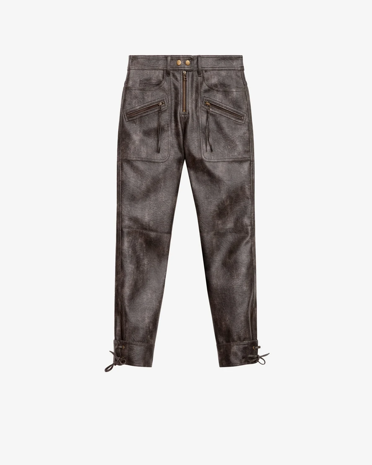Slim fit pants in vintage style faux leather Fitted waistband with loops Snap-fastened and zippered 5 classic pockets Zippered pockets in front Long matching strings Visible ankle zippers Lacing on the hems Medium-rise waist Style: PA0487FAC1B01E02FK CINDY 100% polyester