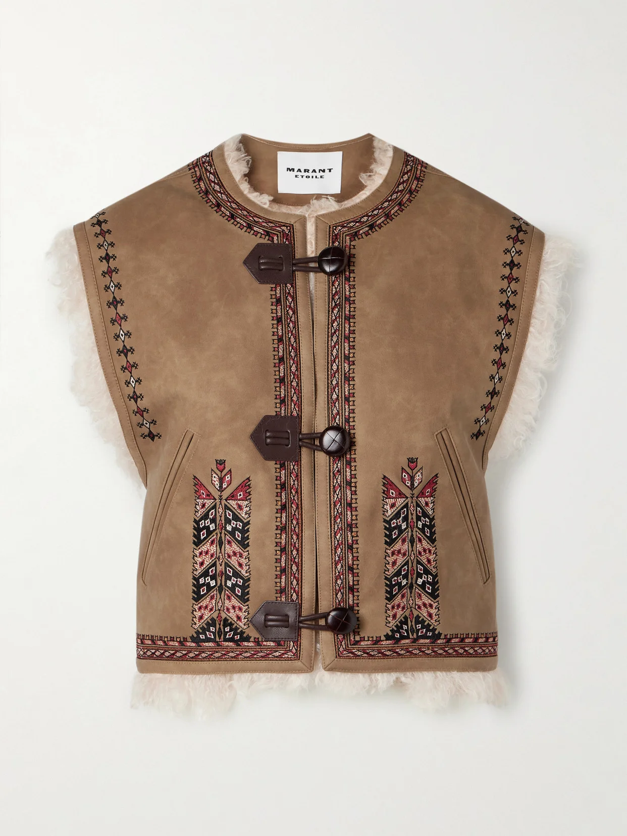 Marant Etoile's 'Clemencia' vest beautifully captures the brand's vintage-inspired, bohemian aesthetic. Made from plush fleece, it's traced with intricate geometric embroidery and fastens with leather-wrapped buttons.