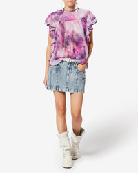 Frilly organic cotton voile cloud print top Gathered round neckline Short gathered sleeves Buttoned teardrop-shaped opening in back Lined Flared cut Style: HT0816FCD1J13E40PK DALYANE 100% cotton (1) Care & Sustainability Machine wash on a gentle cycle, inside out and at a maximum temperature of 30°C For more details, see the instructions on the composition label the history and environmental impact of this product