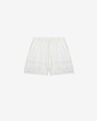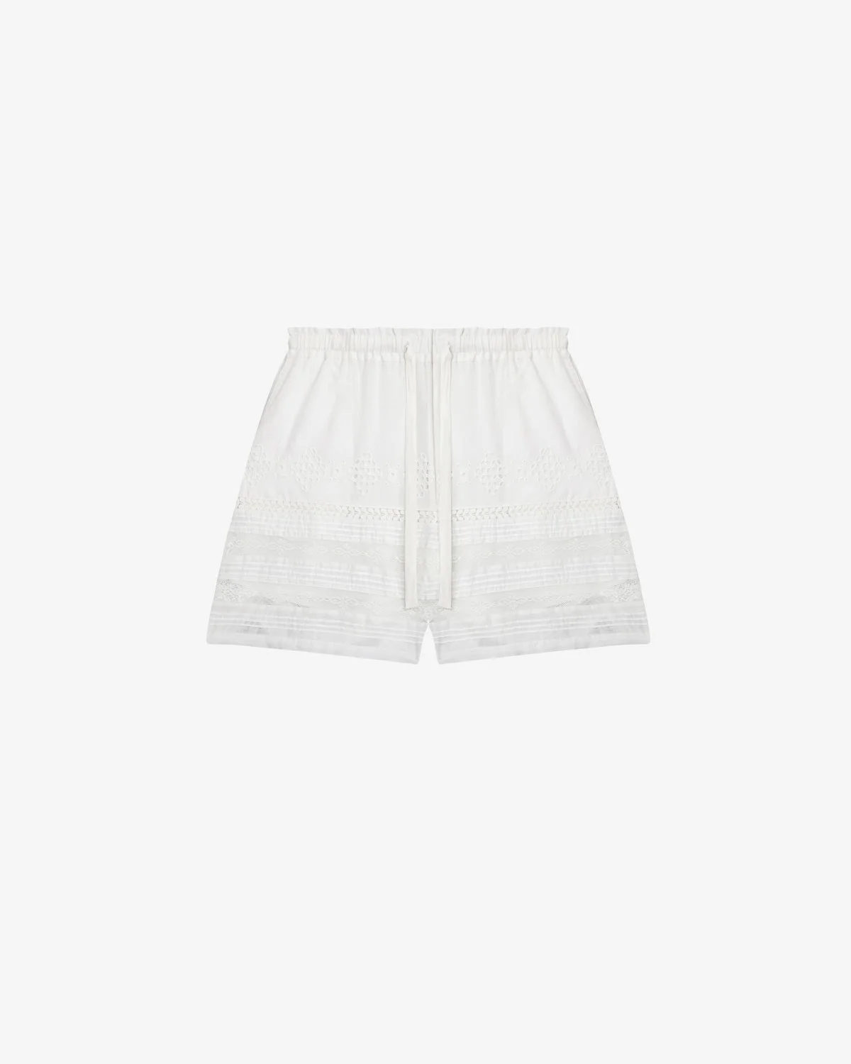 Short shorts in elaborate cotton voile Elastic waist with drawstring Side pockets Lace, openwork English embroidery, pleats, and gathers Tone-on-tone lining Relaxed fit Style: SH0185FAC1J15E20WH DAMINA 100% cotton