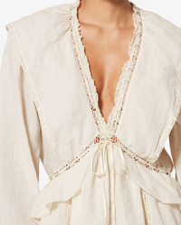 Frilly cotton and linen gauze dress V-neckline adorned with lace Long sleeves with buttoned cuffs Underbust detail with tie ribbon Frills with lace ribbons Lined Flowing cut with see-through design and embroidered finishes Style: RO0974FAD1J11E23EC DAMYA 60% cotton, 36% linen, 4% viscose Care & Sustainability Machine wash on a gentle cycle, inside out and at a maximum temperature of 30°C For more details, see the instructions on the composition label the history and environmental impact of this product