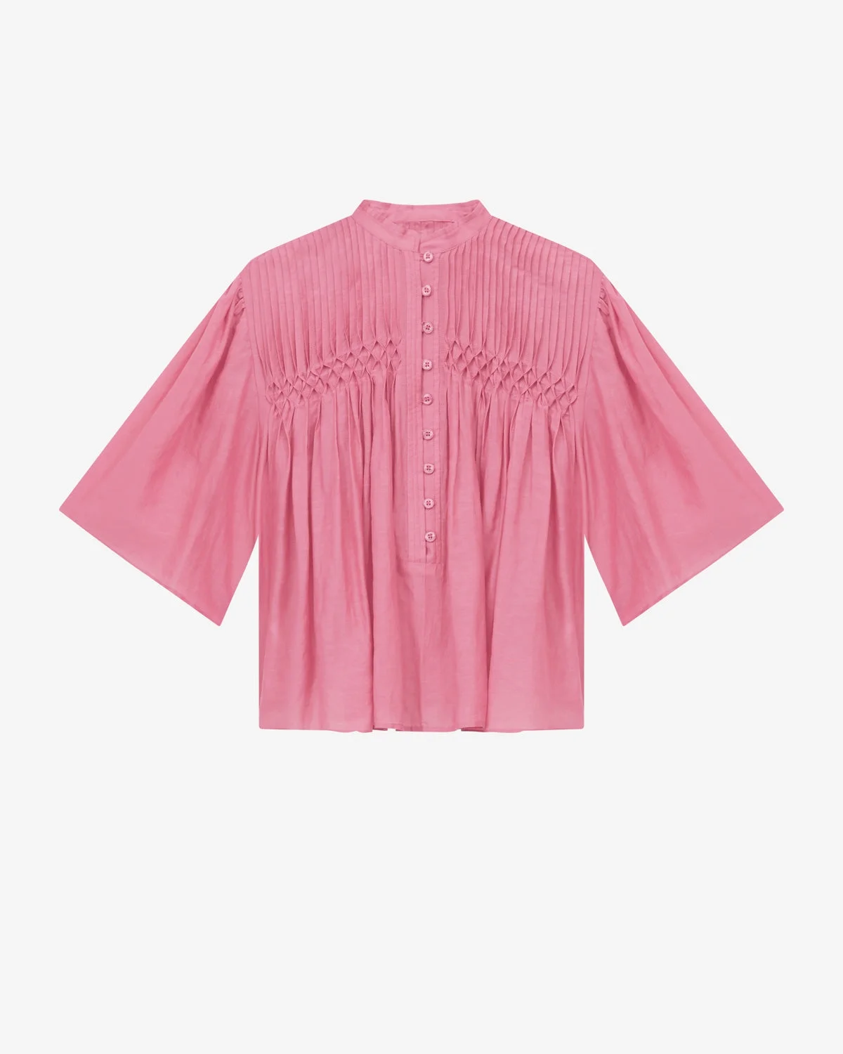 Smocked blouse in plain-colored cotton voile Round neck Buttoned front Pleated and smocked details Short flared sleeves Loose fit Style: HT0456FA-B3J04E DESTINY 80% cotton, 20% viscose