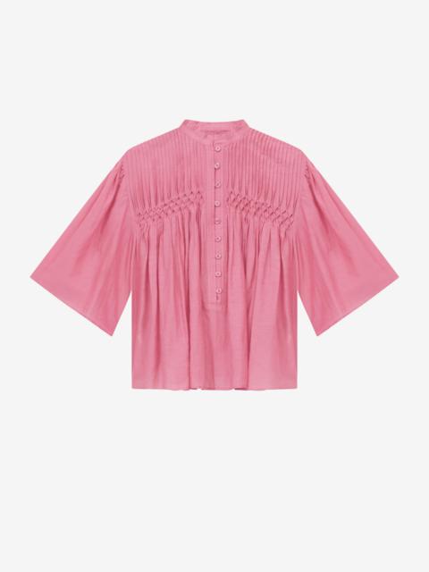 Smocked plain-colored cotton voile top Round neck Buttoned front Pleated and smocked details Short flared sleeves Loose fit Style: HT0456FAB3J04E20WH DESTINY 80% cotton (1), 20% viscose Care & Sustainability Dry clean only For more details, see the instructions on the composition label Organic Textile Certified by Ecocert Greenlife - 257833 The GOTS certification attests that the cotton used for this item is organic. It guarantees respect for the environment and responsible social practices at all stages of its production. the history and environmental impact of this product
