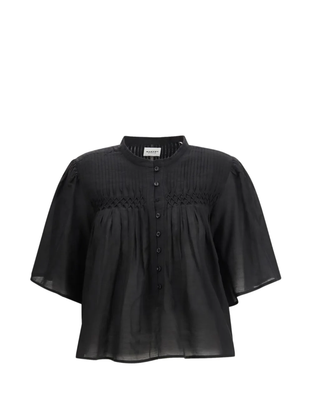 pleated buttoned shirt Highlights - Black - Pleats - Button closure - Short sleeves - High neck Imported Composition Cotton 80%, Viscose 20% Washing instructions Read Manufacturer Guidelines