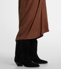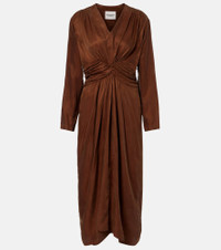 Hailing from Paris, Marant Etoile captures the art of French nonchalance through breezy yet polished staples. The draped and gathered design of this flowy midi dress highlights the cinched waist. Product Details - Material: 60% cupro, 40% viscose - Care instructions: hand wash - Made in China - Designer color name: Tabacco - Item color: brown - Lining: 100% viscose - Collar: V-neck - Closure: zipped side - Fully lined - Item number: P01074514 Size & Fit - Fits large to size - we recommend trying one size smaller - Cinched waist - Non-stretchy fabric - The model seen in the picture is 178cm-5'10" and wearing a size FR 34