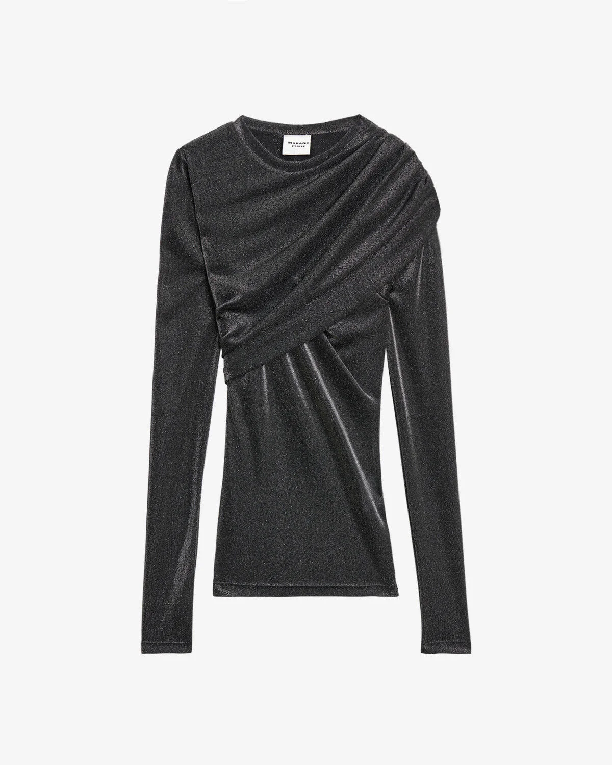 Draped Lurex jersey top Round neckline Gathered and pleated shoulder yoke Long sleeves Gathered front and back Fitted cut Style: HT0656FB-C3K05E DRESSI 70% polyamide, 30% metallic fibers