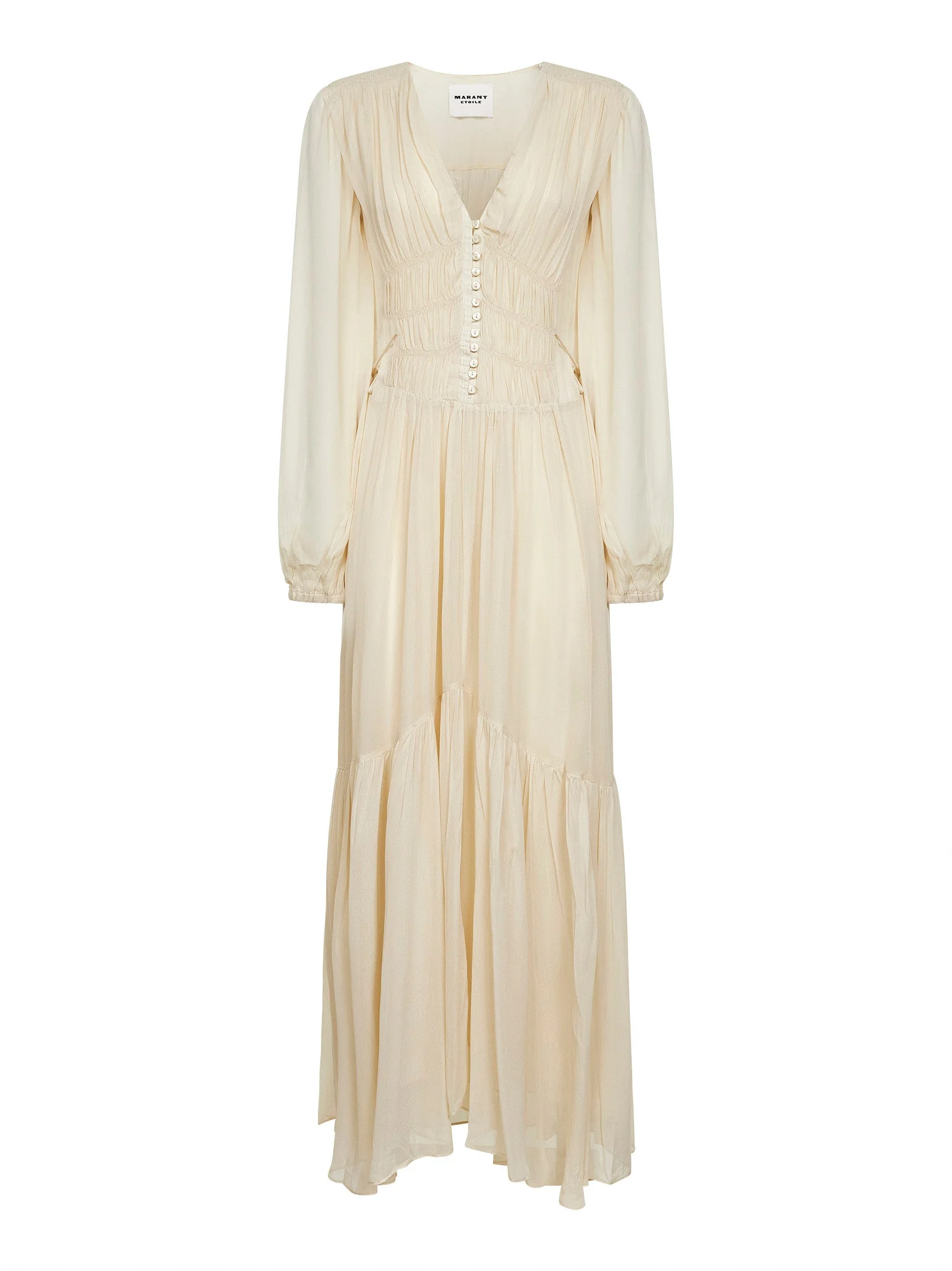 - Front partial button placket - Pleated v-neckline - Long puff sleeves, gathered detailing at shoulders, elasticated cuffs - Adjustable side ties at waist with metallic pearls - Front smocking at bodice; pleated and gathered detailing - Gathered detailing at waist - Back yoke - Flounced skirt - Asymmetric hemline - Lined underskirt - Flared fit - Ecru color - 100% viscose - Made in extra eu Synthetic: viscose100 % Made in: India Season: P26 RO0798FBD1J08E23EC