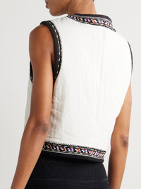 Marant Etoile's collections are bursting with charming detail and vivid prints. Woven with touches of cotton, this vest is padded for lightweight warmth and embroidered with beautiful motifs. Slip yours on over one of the brand's mini dresses or blouses. Size & Fit - 0 = UK 6/ US 2/ FR 34/ IT 38/ XS - 1 = UK 8/ US 4/ FR 36/ IT 40/ S - 2 = UK 10/ US 6/ FR 38/ IT 42/ M - 3 = UK 12/ US 8/ FR 40/ IT 44/ L - 4 = UK 14/ US 10/ FR 42/ IT 46/ XL - 5 = UK 16/ US 12/ FR 44/ IT 48/ XXL - Fits true to size, take your normal size - Designed for a slightly loose fit - Mid-weight, non-stretchy fabric - Model is 180cm/ 5'11" and is wearing the designer's size 1 Model measurements: - Bust: 85cm/ 33.5" - Waist: 62cm/ 24.5" - Hip: 88cm/ 34.5" Details & Care - Ecru and black viscose, cotton and linen-blend - Button fastenings through front - 51% viscose, 35% cotton, 14% linen; padding: 100% cotton - Dry clean