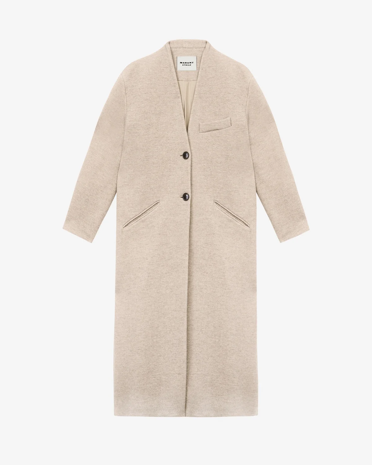 Coat in plain-colored virgin wool Collarless Chest pocket Long sleeves Straight buttoned cuffs Buttoned front Flap pockets on the sides Rear slit Matching lining Straight cut, long length Style: MA0370FAC1E03E90BE ERIS 70% wool, 30% polyamide