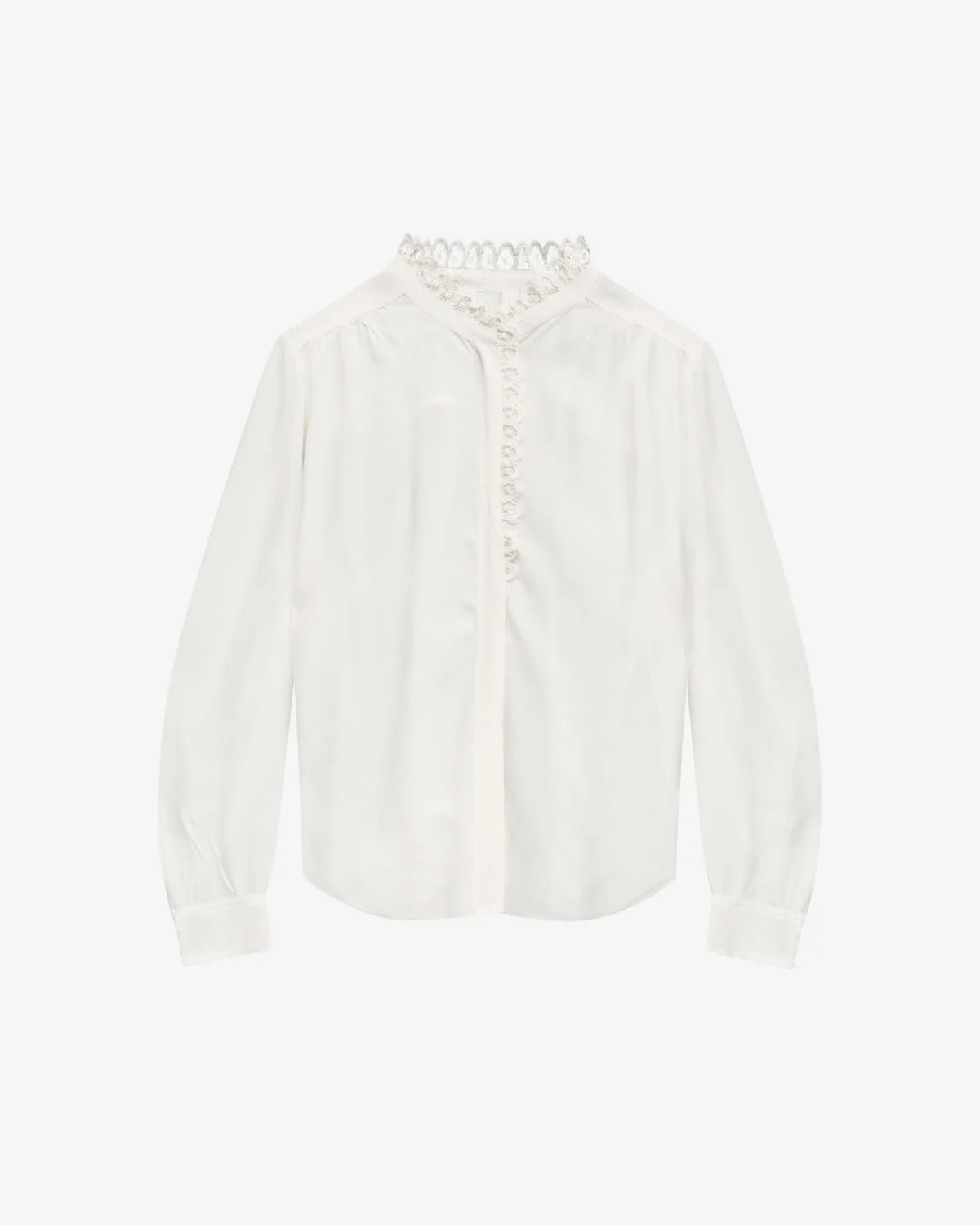 Blouse in plain-colored crepe with English embroidery Round collar with lace trim Shoulder yokes Long blouse style sleeves Straight cuffs Hidden buttons Relaxed fit Style: HT0440FA-B3J05E ESTELA 100% viscose