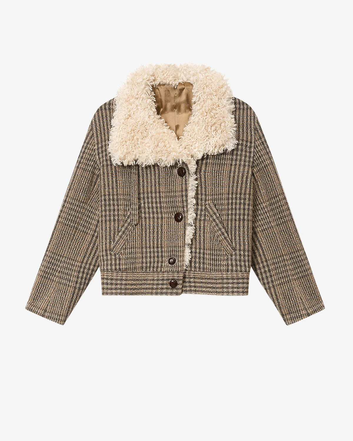 Short Prince-of-Wales check virgin wool jacket style coat Faux fur-lined stand-up collar with retention strap Long sleeves Single-welt pockets on the sides Asymmetrical button tab with round faux leather buttons Straight cut with a tapered hemStyle: MA0526FAD1E02E90BE FADIA 100% virgin wool Care & Sustainability Dry clean only For more details, see the instructions on the composition label