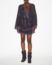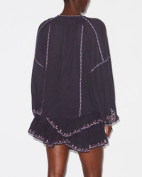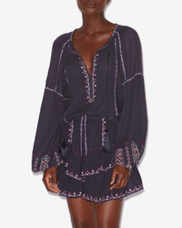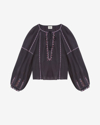 Gauze top with graphic style embroidery Round neckline with strings Strings with tassels Slit in front with hook Long raglan sleeves Tapered cuffs Rounded hem Flowing cut Style: HT0557FAC1J11EFNLI FERNANDA 100% cotton