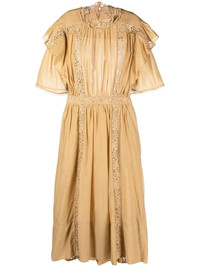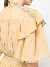 Galina guipure lace-trim dress Isabel Marant Etoile's dress is detailed with wispy ruffles at the sleeves and guipure lace panels for a romantic feel. The ochre-yellow hue lends a touch of subtle colour. Imported Composition Outer: Cotton 67%, Viscose 33% Lining: Cotton 100% SIZE & FIT Model measurements Height 5 ft 9 in(1.76 m) Bust/Chest 33.07 in(84 cm) Hips 34.64 in(88 cm) Waist 25.59 in(65 cm) FittingInformation This piece fits true to size. We recommend you get your regular size Designed for a loose fit with a close fit at the waist Made with a mid-weight non-stretch fabric Washing instructions Hand Wash