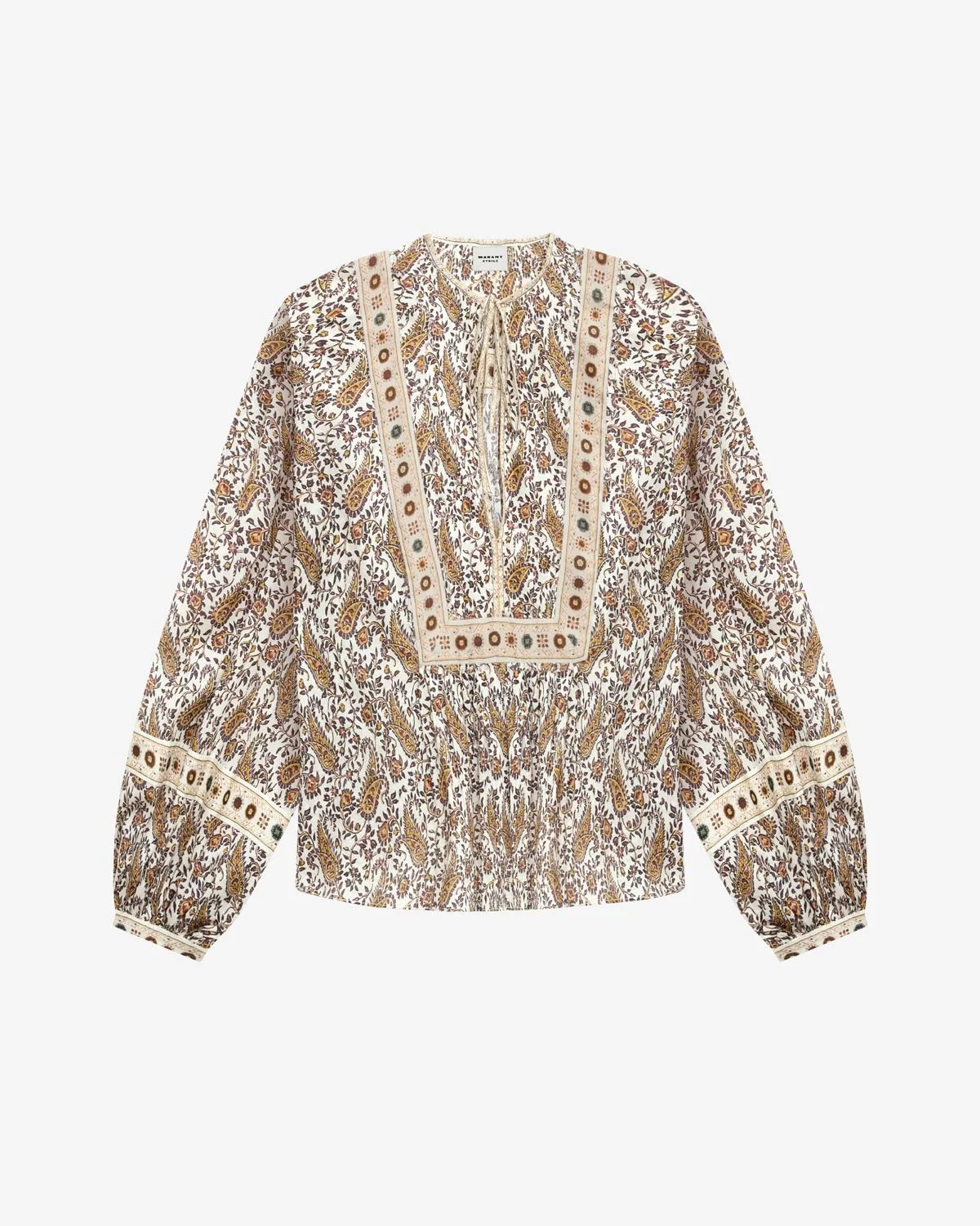 Blouse in printed and gathered cotton voile Round neckline with string Slit in front Gathered front and shoulders Long gathered sleeves Tapered buttoned cuffs Rounded hem Loose fit Style: HT0024FBC1J04E23EC GAYLE 100% cotton