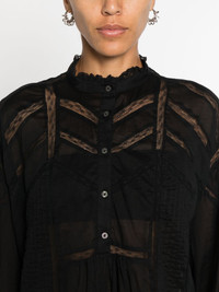 Gelma blouse Highlights - Black - Organic cotton - Voile - Semi-sheer construction - Lace detailing - Frilled neckline - Long sleeves - Buttoned cuffs - Front button fastening - Unlined Imported Composition Organic Cotton 100% SIZE & FIT Model measurements Height 5 ft 10 in(1.78 m) Bust/Chest 33.07 in(84 cm) Hips 36.61 in(93 cm) Waist 24.8 in(63 cm) FittingInformation Designed to be unstructured, offering a loose fit throughout Made from a lightweight non-stretch fabric This piece fits true to size – take your usual size Measurement BUST 45.98 in(116.8 cm) LENGTH 22.99 in(58.4 cm) WAIST 52 in(132.1 cm) SLEEVE LENGTH 19.48 in(49.5 cm) Washing instructions Machine Wash