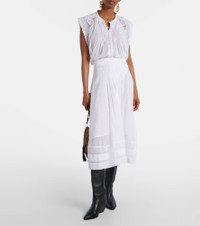 The Grecia blouse by Marant Etoile is a breezy yet polished staple. Crafted from cotton with delicate lace trims, this timeless piece features a classic buttoned front—perfect for elevated everyday wear. Product Details - Material: 100% cotton (organic) - Care instructions: machine wash at 30 degrees - Made in India - Designer color name: White - Item color: white - Trim: 100% cotton (organic) - Embroidery: 100% polyester - Closure: buttoned front - Unlined - Item number: P01074539 Size & Fit - True to size - Semi-sheer - Designed for a loose fit - Non-stretchy fabric - Falls to the hip - The model seen in the picture is 178cm-5'10" and wearing a size FR 36
