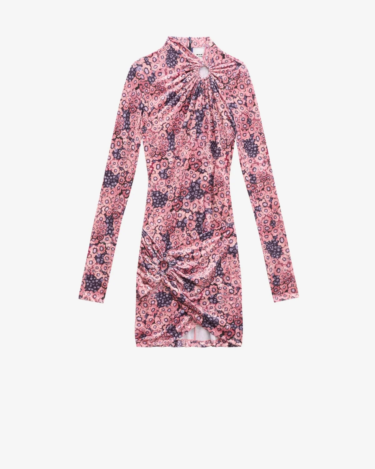 Short draped dress in printed velvet Asymmetrical neckline with ring Long sleeves Asymmetrical skirt with ring Fitted cut Style: RO0560FA-B3K01E HAVANA 94% polyester, 6% elastane