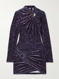 EDITORS'NOTES Marant Etoile's 'Havana' mini dress is made from plush velvet featuring a dainty floral motif, a recurring theme throughout the label's collections. It's gathered along the O-ring cutouts, creating asymmetric texture, and has a slim fit with a wrap-effect skirt. SIZE & FIT Model measurements: - Fits true to size, take your normal size - Designed for a slim fit - Mid-weight, stretchy fabric - Model is 175cm/ 5'9" and is wearing a FR 36 - Bust: 79cm/ 31" - Waist: 61cm/ 24" - Hip: 89cm/ 35" DETAILS & CARE - Tonal-purple velvet - Concealed button and zip fastening at back - 94% polyester, 6% elastane; lining: 100% cotton - Dry clean