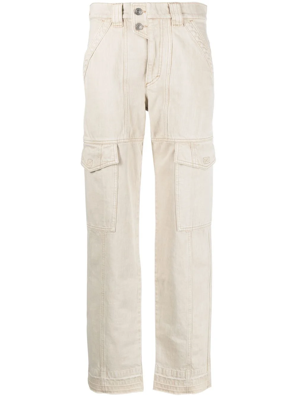 Vayoneo cargo jeans Isabel Marant Etoile's trousers riff on classic cargo styles. Complete with exposed-seam detailing, this ecru iteration is made of cotton and sits high on the waist. Highlights - Ecru - Cotton - Belt loops - Front button and zip fastening - Two side cargo pockets - Straight leg Made in France Composition Cotton 100% SIZE & FIT Model measurements Height 5 ft 10 in(1.77 m) Bust/Chest 31.49 in(80 cm) Hips 33.85 in(86 cm) Waist 22.44 in(57 cm) FittingInformation This piece fits true to size. We recommend you get your regular size Designed to be fitted at the waist and hips, loose over the leg Made with a mid-weight non-stretch fabric Measurement FRONT RISE 10.98 in(27.9 cm) INSIDE LEG 32.51 in(82.6 cm) BACK RISE 12.99 in(33 cm) HIPS 32 in(81.3 cm) Hem Width 14.01 in(35.6 cm) WAIST 30 in(76.2 cm) Washing instructions Machine Wash