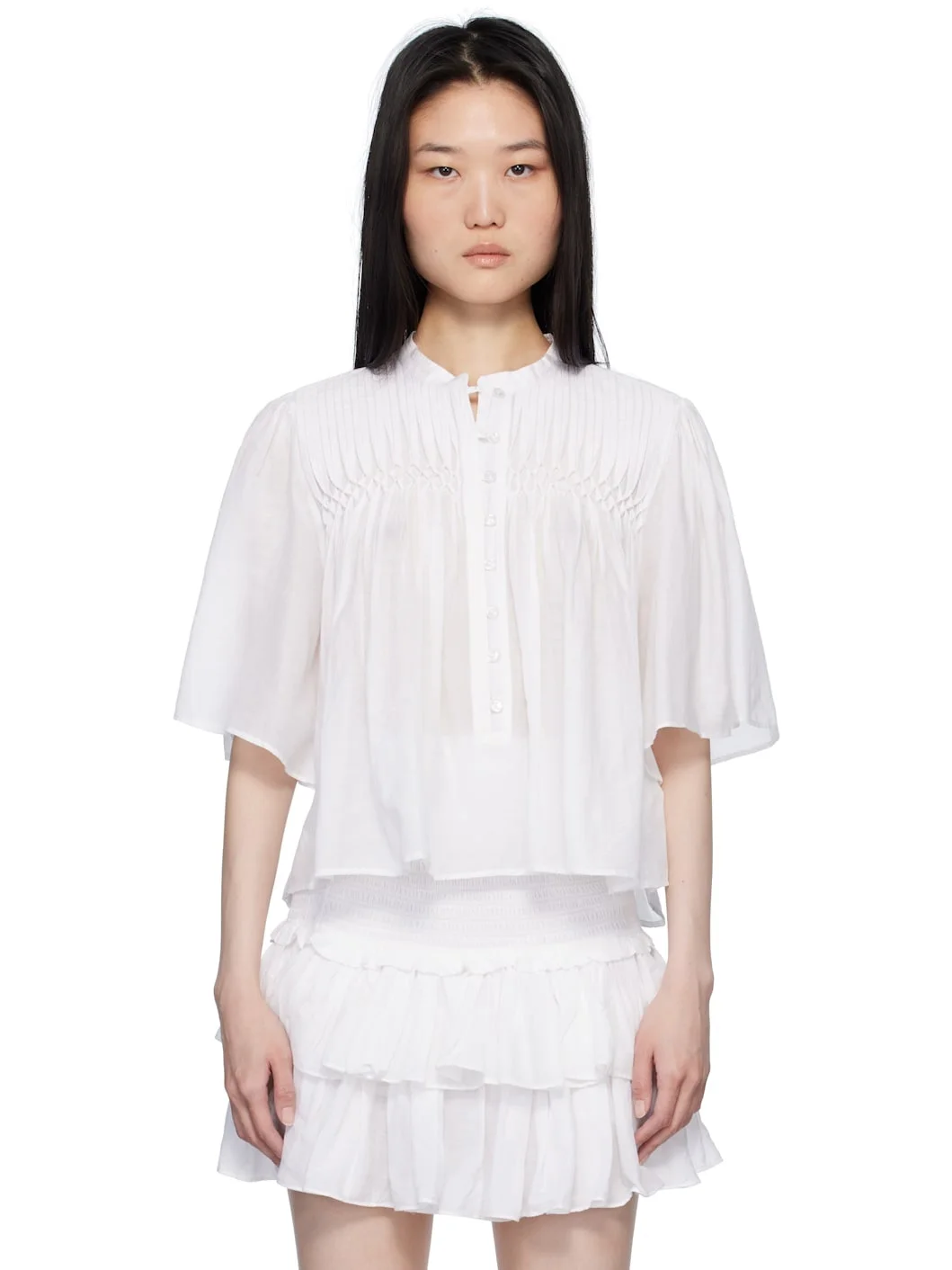 Semi-sheer cotton-blend voile blouse. Pleats and smocking throughout. · Band collar · Eight-button placket · Cropped hem Supplier color: White 80% cotton, 20% viscose. Made in India 251599F107020
