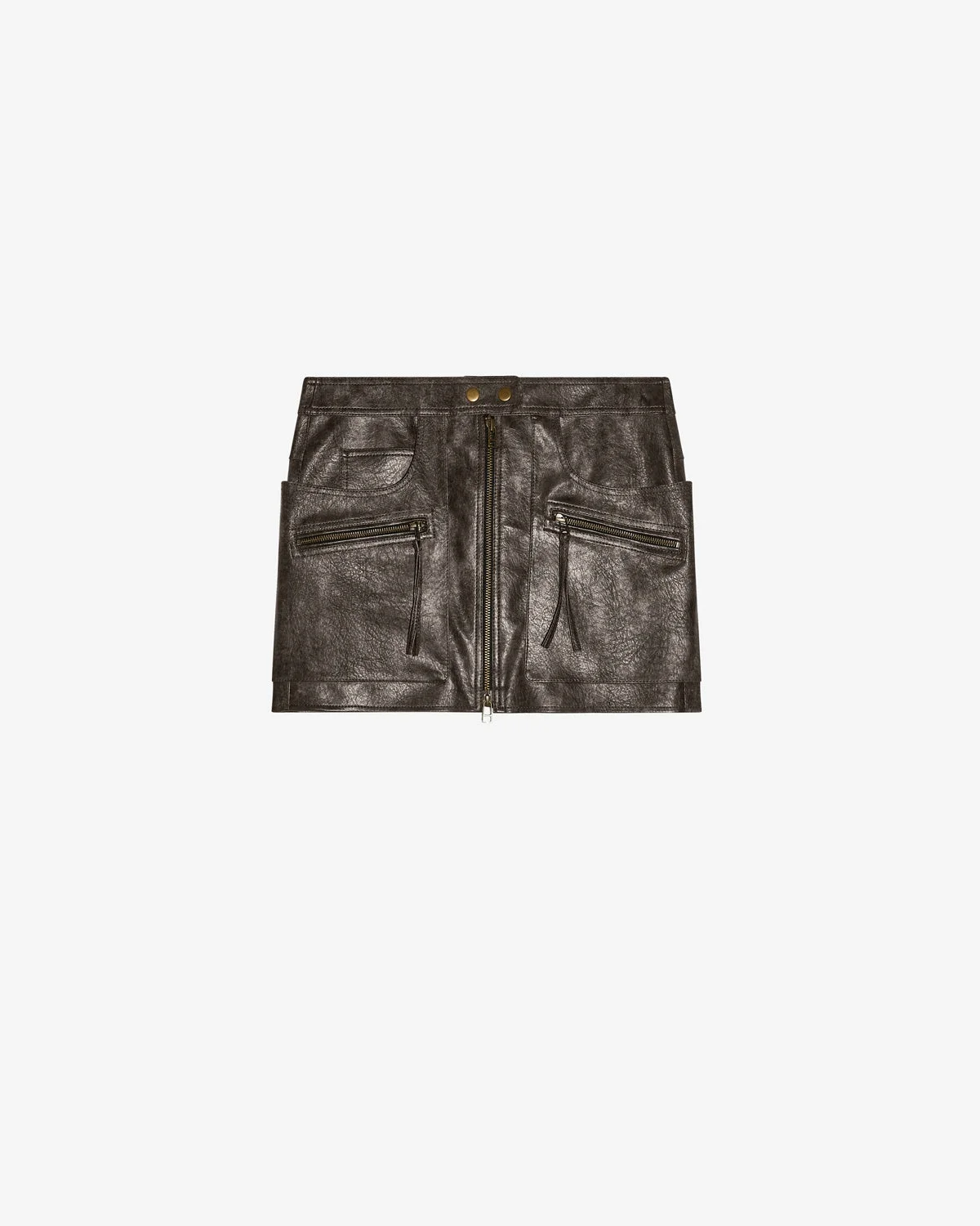 Mini skirt in vintage style faux leather Fitted waistband Snap-fastened Done up in front with a two-way zipper 5 classic pockets Zippered pockets Long fabric ties Fitted cut Style: JU0292FAC1B01E02FK CLAUDINE 100% polyester