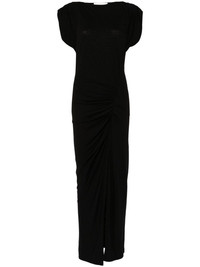 Isabella midi dress Highlights - Black - Stretch-design - Draped design - Ruched detailing - Gathered detailing - Boat neck - Short sleeves - Fitted waistline - Front slit - Straight hem - Mid-calf length Imported Composition Polyamide 50%, Linen/Flax 30%, Wool 20% SIZE & FIT Model measurements Height 5 ft 9 in(1.75 m) Bust/Chest 34.64 in(88 cm) Hips 36.61 in(93 cm) Waist 26.37 in(67 cm) FittingInformation Designed for a slim fit that sits just away from the body offering a close yet comfortable fit Made from a midweight non-stretch fabric, this piece offers minimal elasticity when worn Washing instructions Dry Clean Only