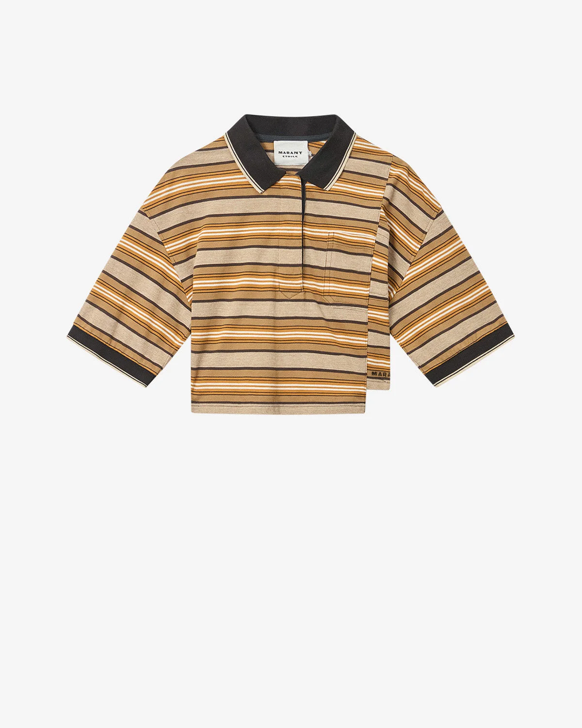 Striped organic cotton pique polo top Contrasting polo collar extended by a hidden button tab Short sleeves with dropped armholes Patch pocket on the chest "Marant" logo on the front left side Asymmetrical hem Loose fit Style: HT0836FAD1K04EBEKH ISALYNE 100% cotton Care & Sustainability Machine wash on a gentle cycle, inside out and at a maximum temperature of 30°C For more details, see the instructions on the composition label Organic Textile Certified by Ecocert Greenlife - 257833 The GOTS certification attests that the cotton used for this item is organic. It guarantees respect for the environment and responsible social practices at all stages of its production. the history and environmental impact of this product
