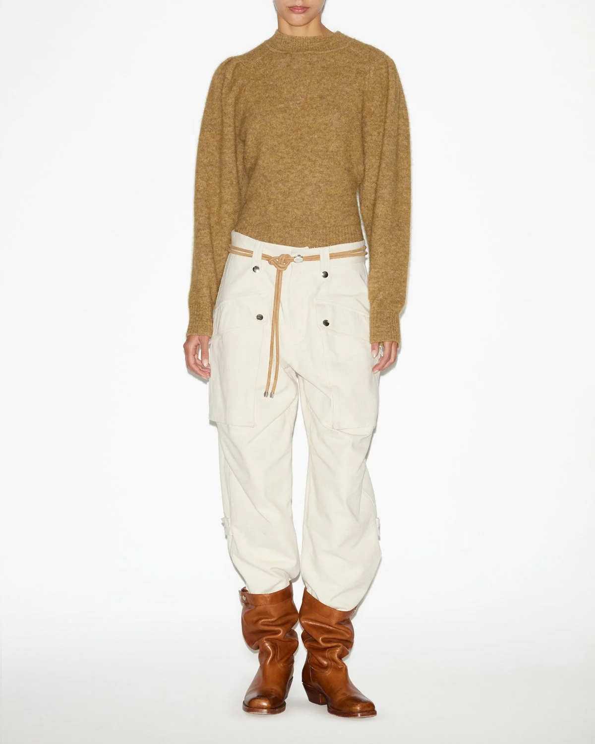 Workwear style plain-colored cotton pants Fitted waistband with snap-fastened loops Done up with visible snap buttons and a zipper Gusseted side pockets with snap-fastened flaps Decorative tabs on the sides Zippered pockets on the back Silver metal details Loose fit, ankle length Style: PA0373FA-B3G02E JANNICK 100% cotton