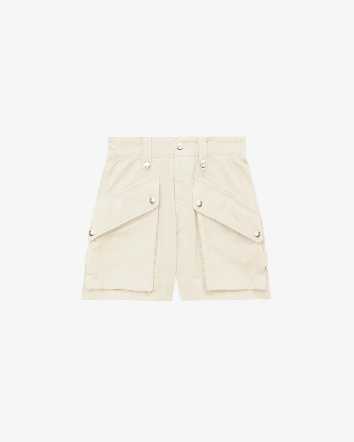 Workwear style shorts in plain-colored cotton Fitted waistband with snap-fastened loops Done up with a visible snap button and a zipper Gusseted side pockets with snap-fastened flaps Decorative tabs on the sides Zippered pockets on the back Silver metal details Cropped cut Style: SH0167FA-B3G02E JEMMY 100% cotton
