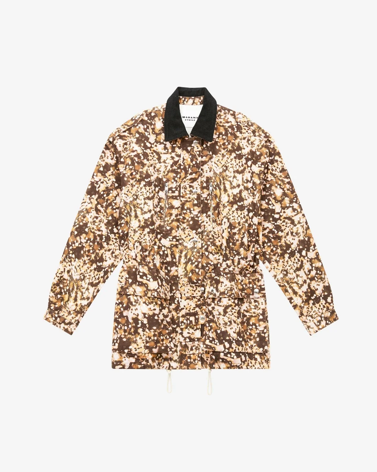 Workwear style jacket in printed denim Contrasting corduroy shirt collar Shoulder tabs Long sleeves Snap-fastened cuffs Zippered pockets on the front Gusseted pockets with snap-fastened flaps Adjustable drawstring on inside of waist Done up with a zipper, snap buttons, and snap-buttoned tabs Silver-finish metal details Unlined Straight cut Style: VE0358FB-B3G01E JOANNA 100% cotton
