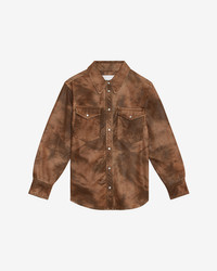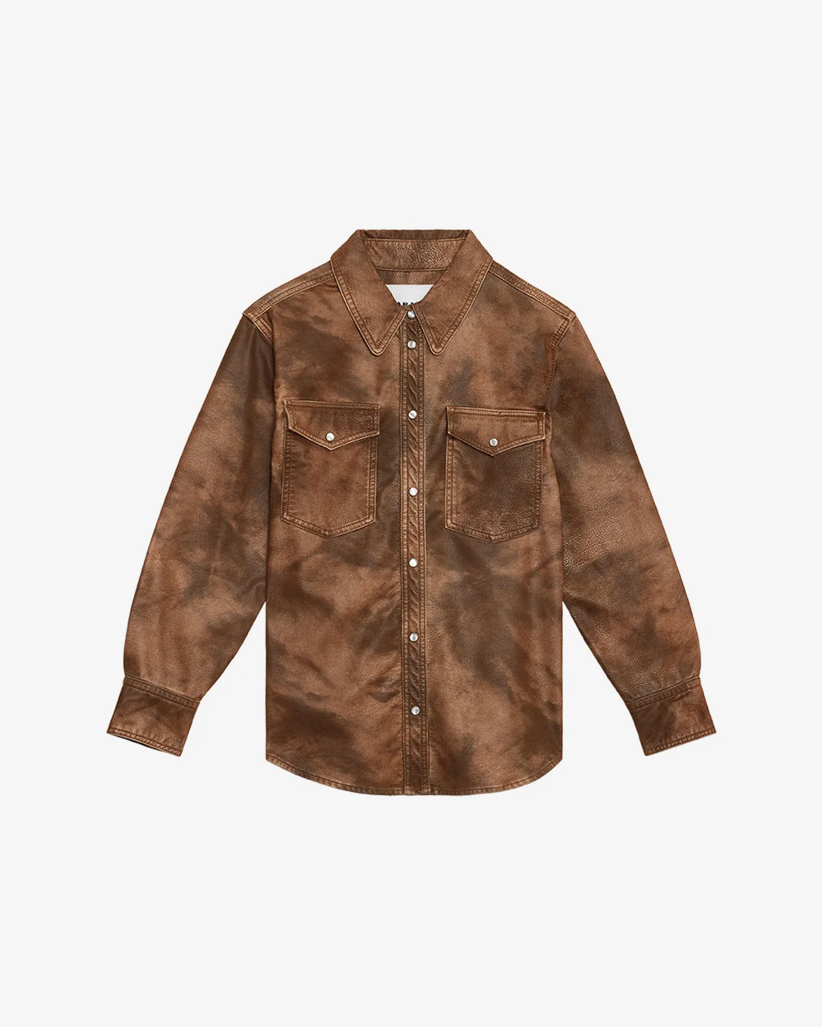 Vintage style faux leather shirt Shirt collar Long sleeves Straight snap-fastened cuffs Snap-fastened front Patch pockets with snap-fastened flaps Pearly snap buttons Rounded hem Straight cut Style: CH0240FAC3B01E50TO KARIMA 63% polyurethane, 28% viscose, 5% other fibers, 4% polyamide