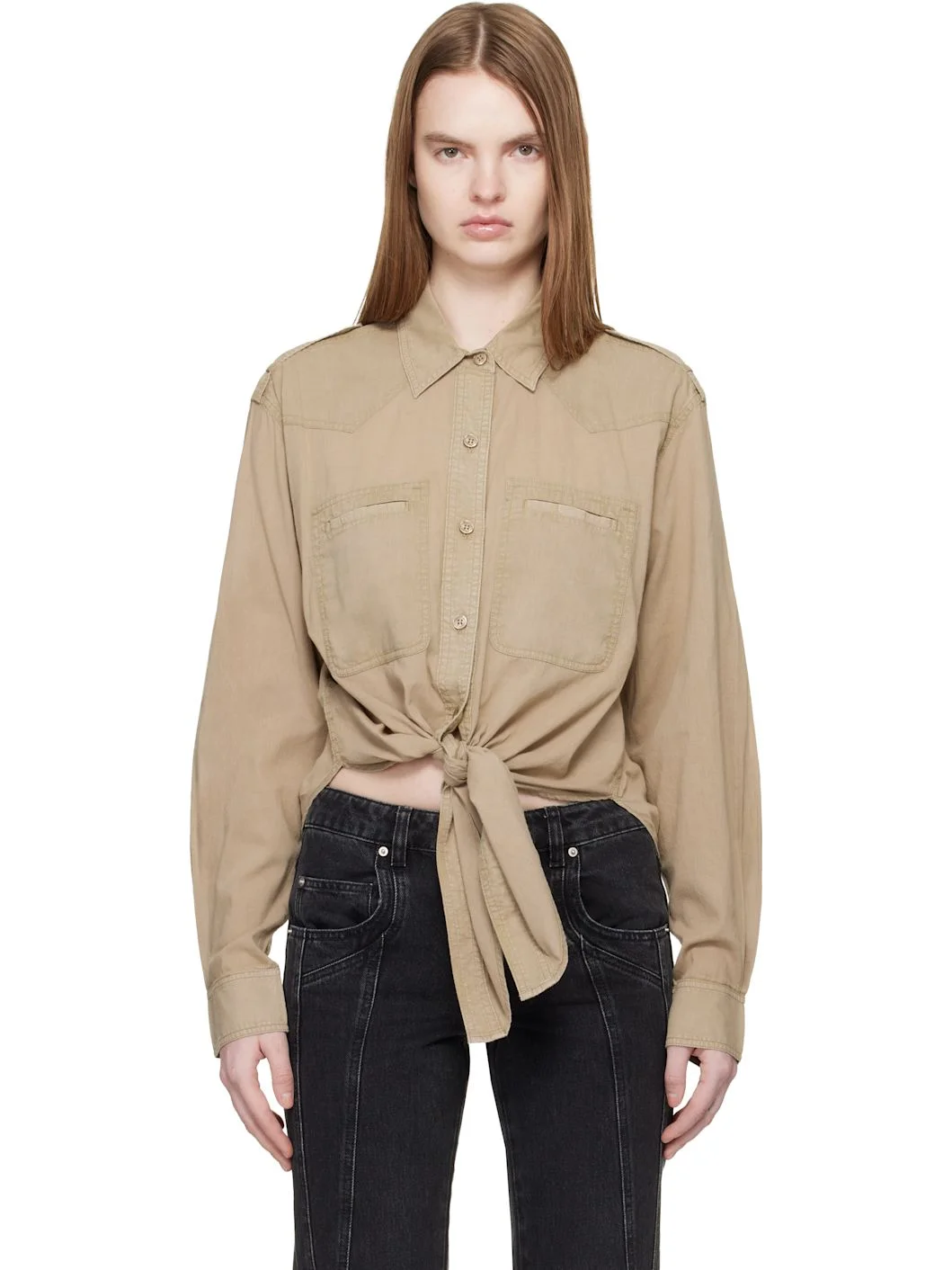 Plain-woven organic cotton shirt. · Spread collar · Button closure · Patch pockets at chest · Self-tie straps at front shirttail hem · Button epaulet at dropped shoulders · Button at sleeves · Pleats at barrel cuffs and back yoke Supplier color: Light khaki 100% organic cotton. Made in India 261599F109001