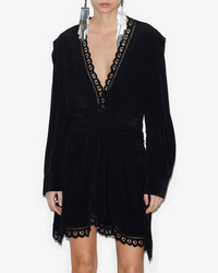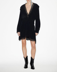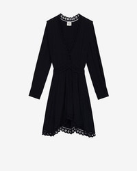 Dress in plain-colored crepe with English embroidery Low-cut V-neckline Long sleeves with straight cuffs Slant pockets Done up with a hidden side zipper Elaborate finishes Asymmetrical hem Crepe lining Flared cut with a fitted waist Style: RO0534FA-B3J05E FELIE 100% viscose