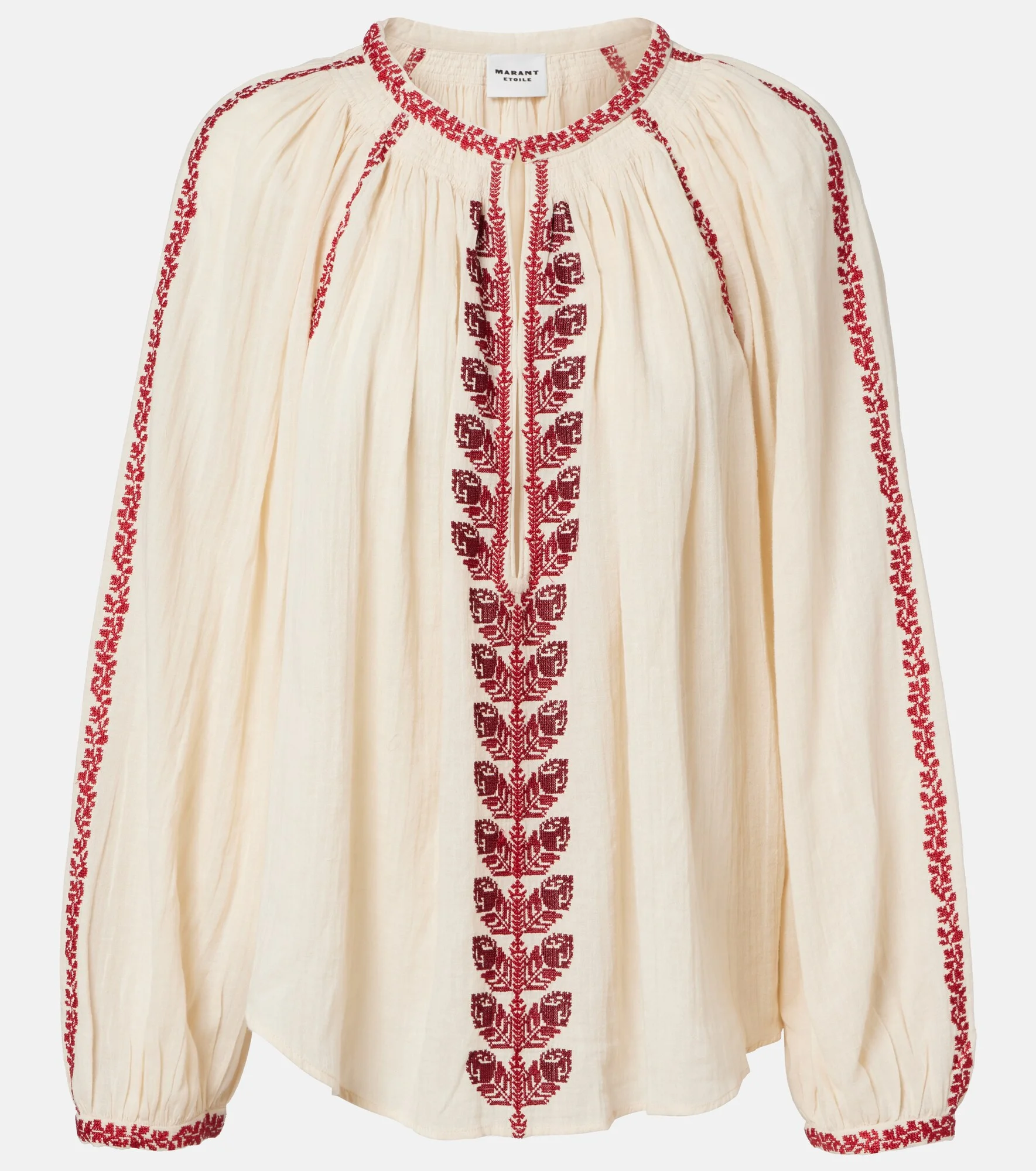 Hailing from Paris, Marant Etoile captures the art of French nonchalance through breezy yet polished staples. Made from pure cotton, the Lena blouse features a long-sleeved design with voluminous sleeves and delicate embroidery throughout. Product Details - Material: 100% cotton (organic) - Care instructions: hand wash - Made in India - Color: beige - Designer color name: Beige/Red - Material II: 100% cotton - Lining: 100% cotton - Embroidery: 100% viscose - Closure: hook fastening - Item number: P01132225 Size & Fit - True to size - Designed for a loose fit - Non-stretchy fabric - Falls below the hip - The model seen in the picture is 178cm-5'10" and wearing a size FR 36