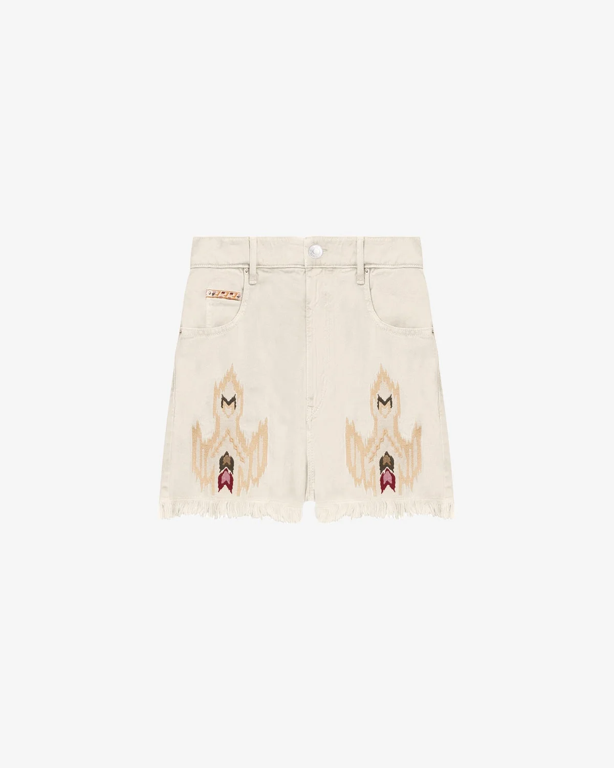 Short shorts in embroidered denim Fitted waistband with loops Metal button tab with a zipper 5 classic pockets Leather label in back with an embossed "Isabel Marant" logo Fringed finishes Metal rivets Silver-finish metal details Graphic style embroidery High waist Style: SH0001FEC1H02E23EC LESIA 80% cotton, 20% hemp