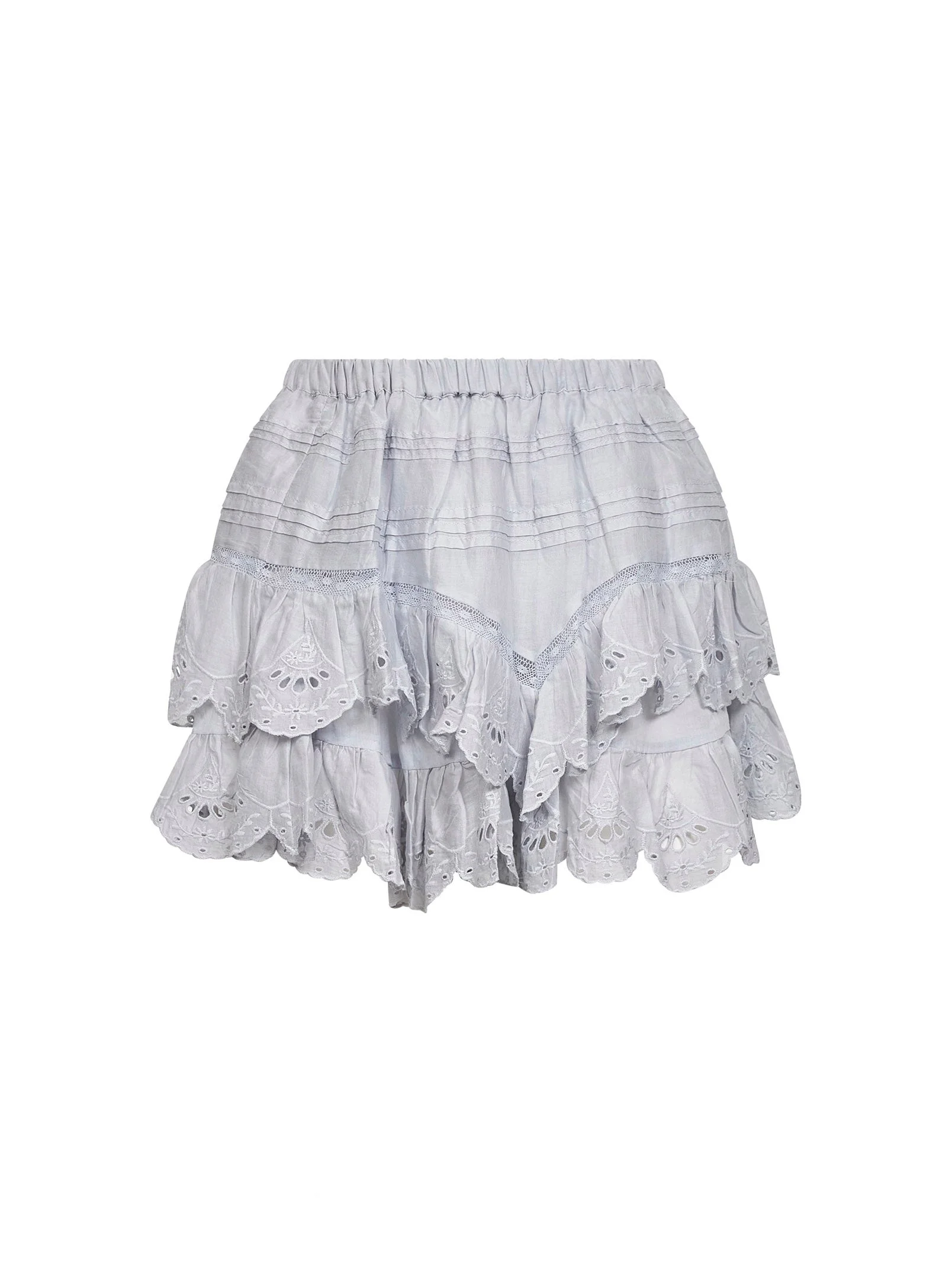 - Elasticated waistband - Pintucks detailing at waist and hips; openwork floral lace insert - Ruffles at bottom with broderie anglaise embroidery - Scalloped hem - Flounced design - Fluid fit - Light blue color - 100% cotton - Made in extra eu Natural (Veg): Cotton100 % Made in: India Season: P26 SH0021FED1J05E30LU