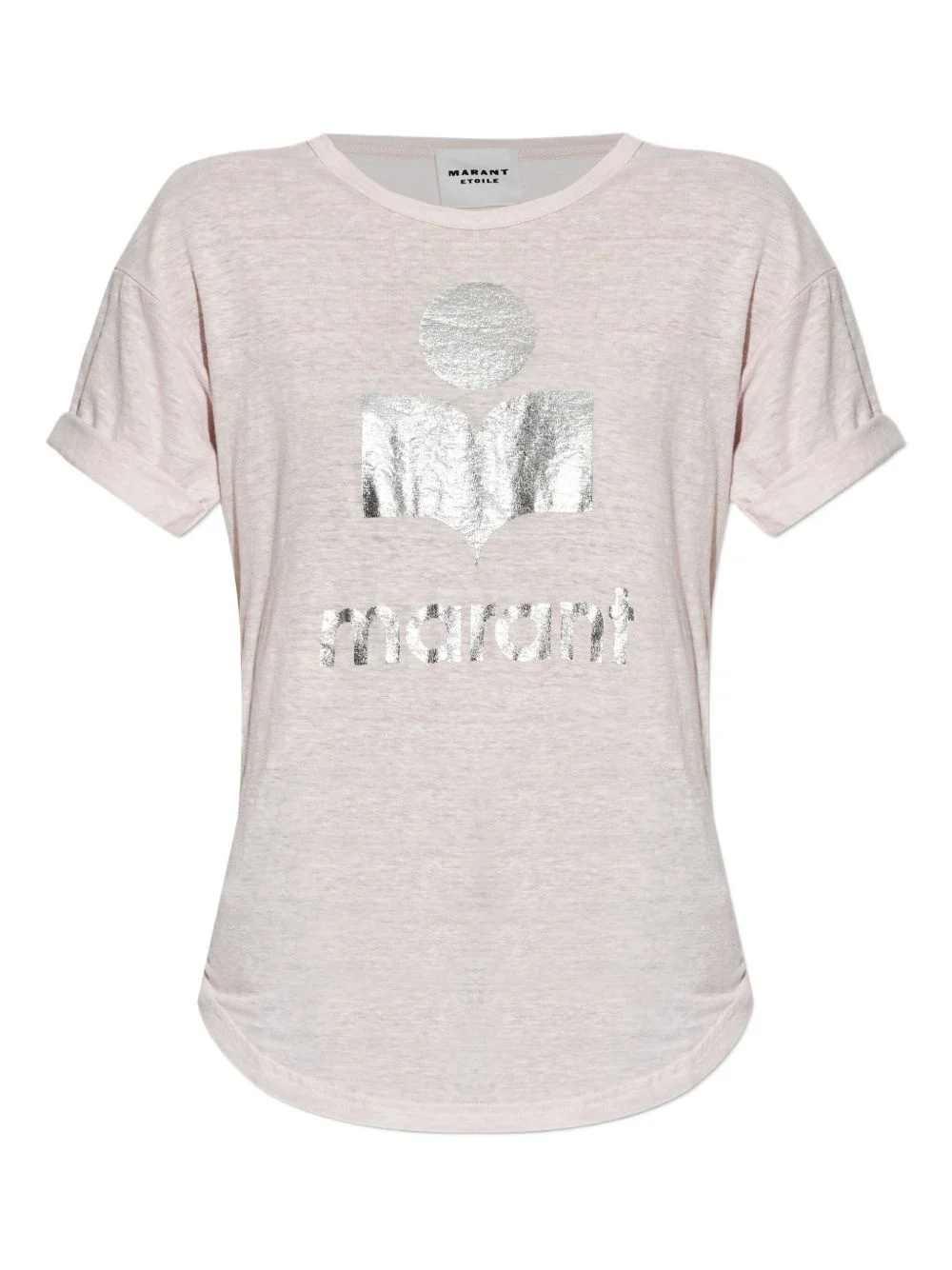 logo-print linen top Highlights - Powder pink - Metallic logo print - Short sleeves - Round neck - Curved hem - Linen Imported Composition Linen/Flax 100% Washing instructions Read Manufacturer Guidelines
