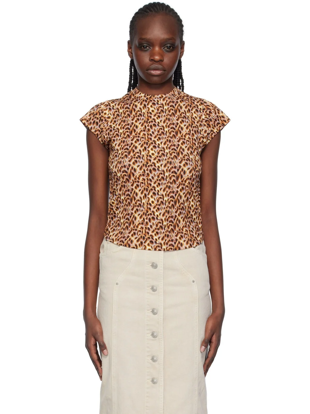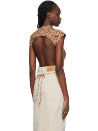 Stretch viscose jersey T-shirt. Leopard pattern printed throughout. · Crewneck · Ruching at side seams · Self-tie straps at open back Supplier color: Ochre 95% viscose, 5% elastane. Made in Bulgaria 241599F110005