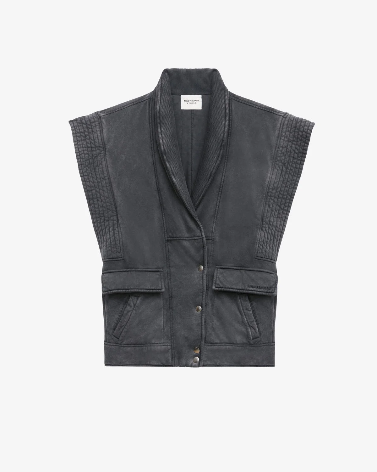 Plain-colored cotton vest Ribbed shawl collar Structured, padded armholes Double-breasted with snap buttons Side pockets Matching "Marant" logo embroidered on the pocket Straight cut Style: VE0345FA-B1M02E NAELLE 100% cotton