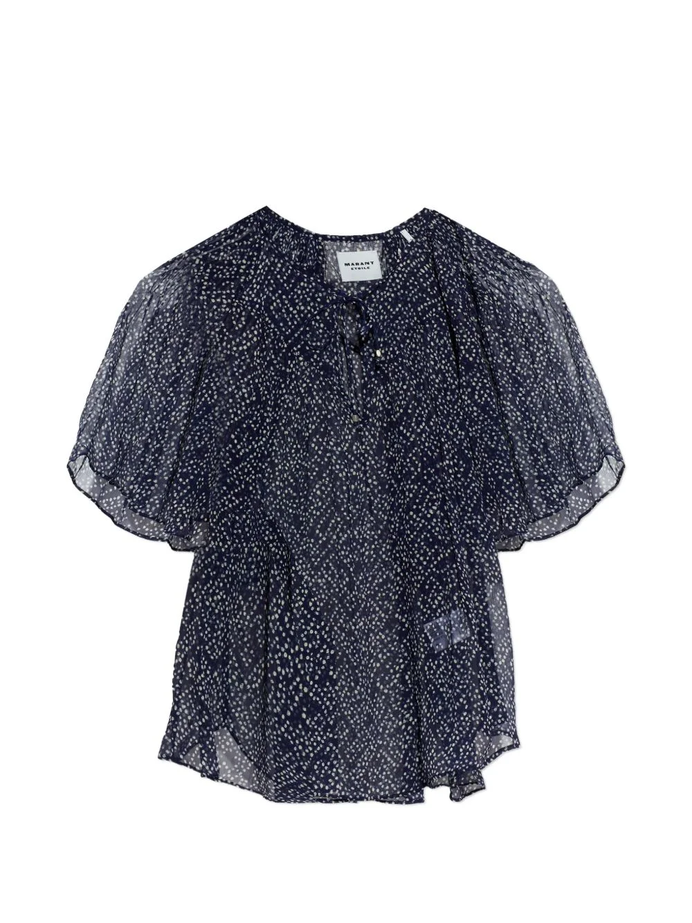 Neslya ruffled printed top Highlights - Midnight blue - Tie fastening - Ruffled details - Short sleeves Imported Composition Viscose 100% Washing instructions Read Manufacturer Guidelines
