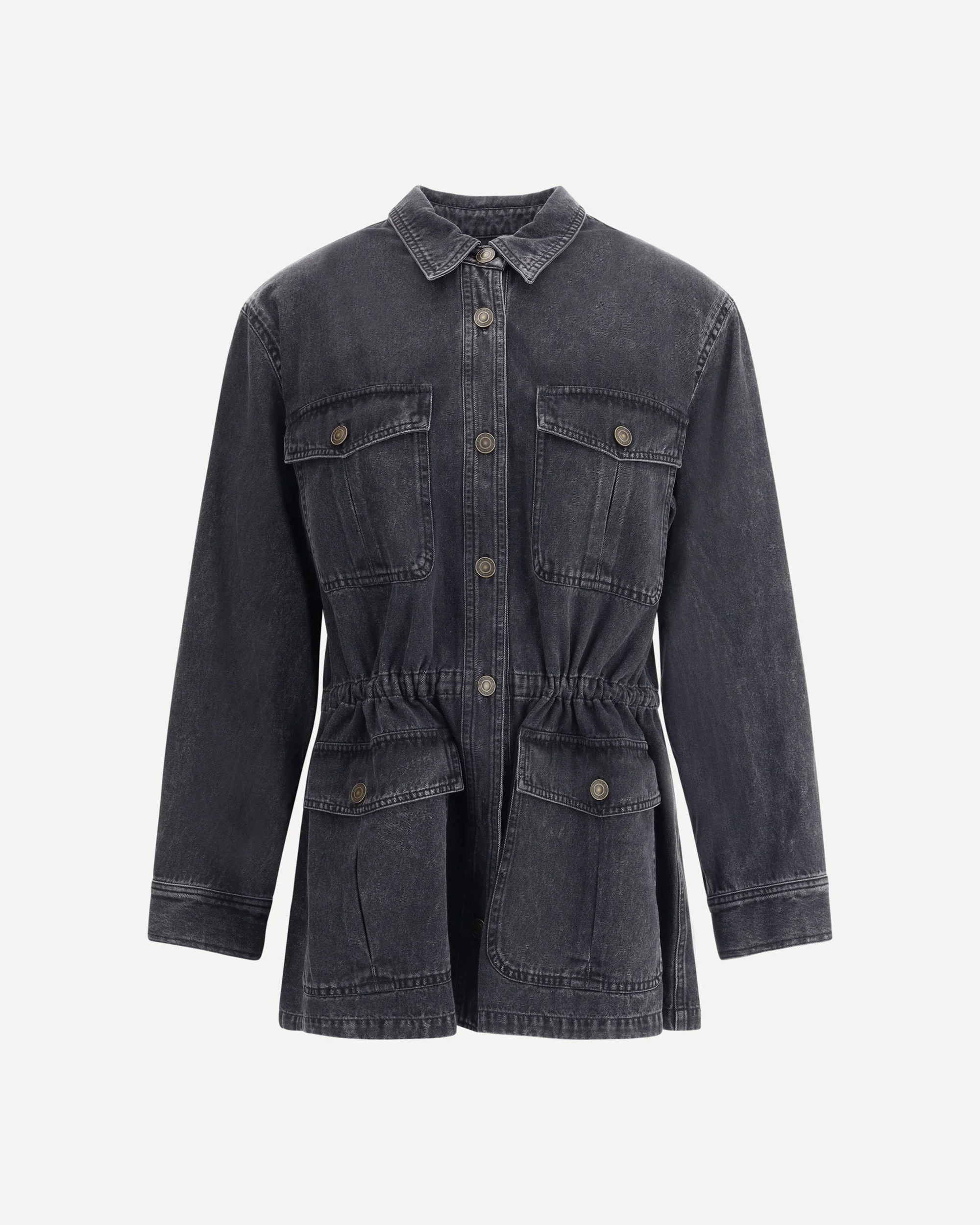 The Nossia denim Jacket by Marant Etoile combines a classic design with functional details. Featuring a traditional collar and four patch pockets on the front, it provides practicality without sacrificing style. The front button closure and elasticated waistband ensure a comfortable, slightly contoured fit, perfect for a casual, contemporary look. DETAILS - Sku: VE0527FAB1H04E_01VB - Season: AW25 - Fit: Regular - Composition: GENERAL 100% Cotton - MADE IN TUNISIA
