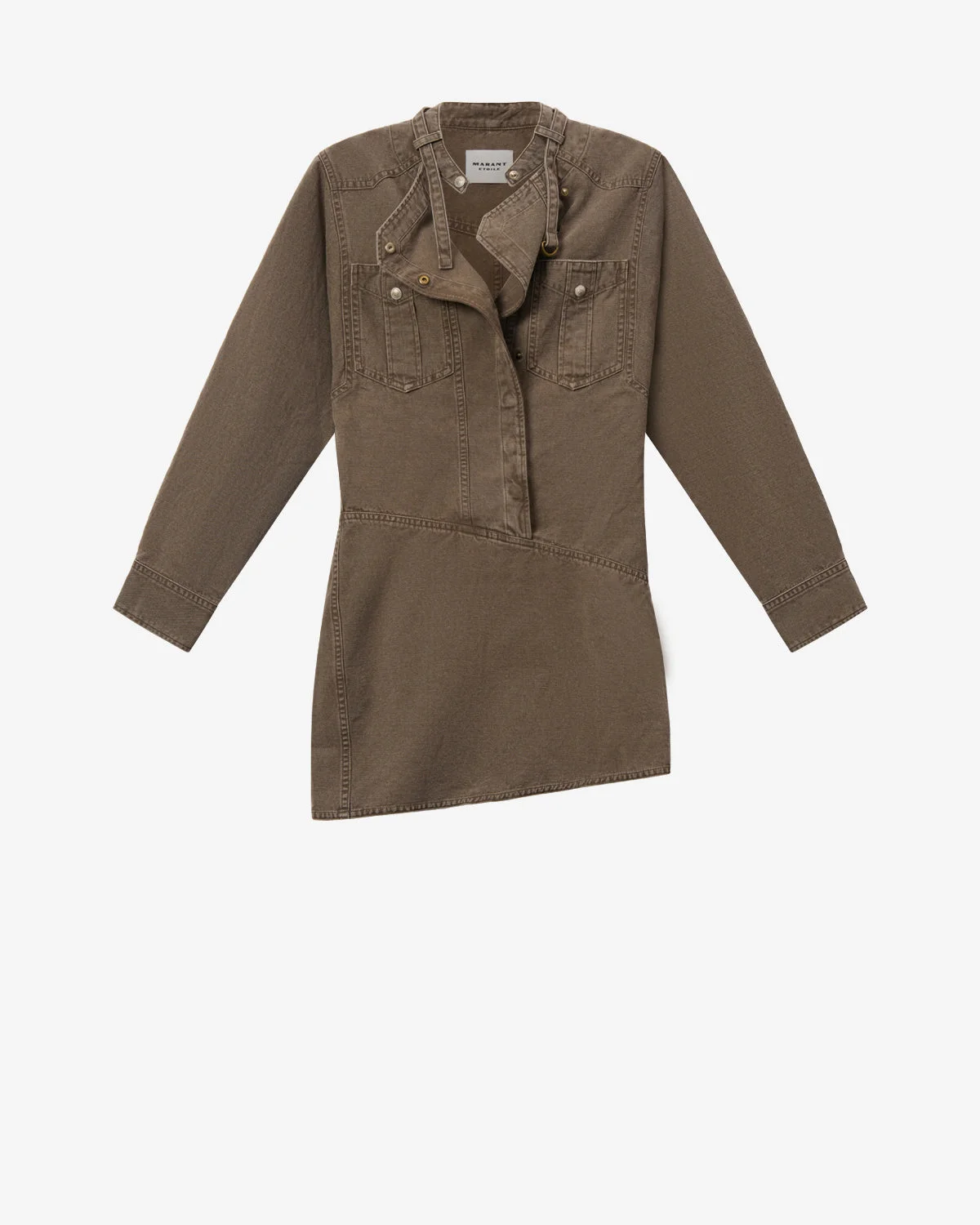 Lightweight cotton denim shirt dress Small stand-up collar with loops, tab, and retention strap Long loose sleeves with snap-fastened cuffs Asymmetrical front with hidden engraved snap buttons Snap-fastened patch pockets on the chest Piped pockets in back Asymmetrical hem Relaxed fit Style: RO0959FAD1G04E50DZ NOURIA 80% cotton, 20% linen Care & Sustainability Machine wash on a gentle cycle, inside out and at a maximum temperature of 30°C For more details, see the instructions on the composition label the history and environmental impact of this product