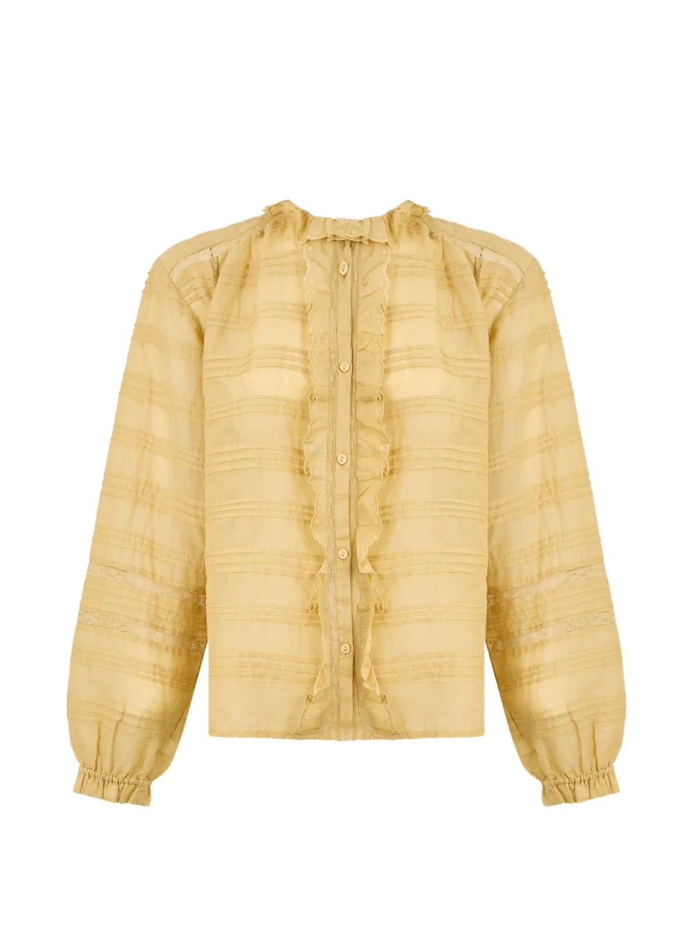 Peline ruffled button blouse Highlights - Light yellow - Ruffled trims - Button fastening - Long sleeves - Elasticated cuffs - Horizontal pintucks Imported Composition Cotton 100% Washing instructions Read Manufacturer Guidelines