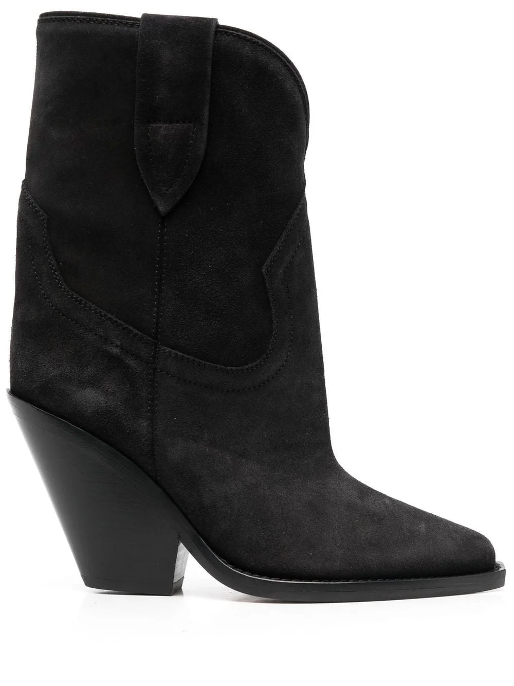 Leyane 90mm suede boots Isabel Marant Etoile's bohemian aesthetic comes to play in these suede ankle boots, evident in the western-style pointed toe shape and tapered high block heel. Highlights - Black - Suede - Pointed toe - Slip-on style - Branded leather insole - High tapered heel Made in Italy Composition Suede 100%