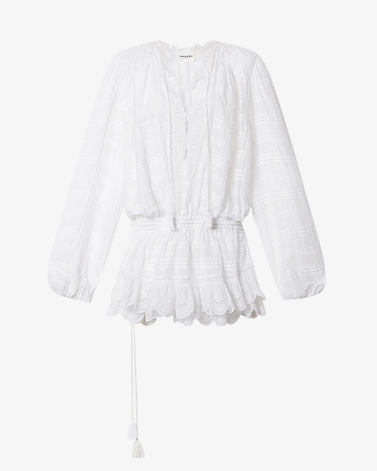 Short ruffled organic cotton and floral lace dress Round collar and tie-up Tunisian neckline with pompom drawstrings Long sleeves with elasticated cuffs Elastic waist with pompom drawstrings Skirt with frills and pintucks Flared cut Style: RO0952FAD1J05E20WH PREYA 100% cotton (1) Care & Sustainability Machine wash on a gentle cycle, inside out and at a maximum temperature of 30°C For more details, see the instructions on the composition label the history and environmental impact of this product